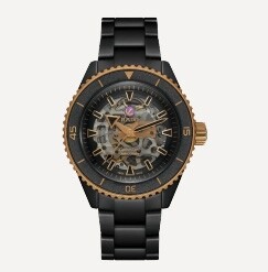Black, with black-tinted sapphire crystal Brushed rose gold-colored applied indices with black Super-LumiNova® Brushed rose gold-colored PVD-coating moving anchor symbol with synthetic ruby backplate Rose gold printed Rado and Captain Cook logos.