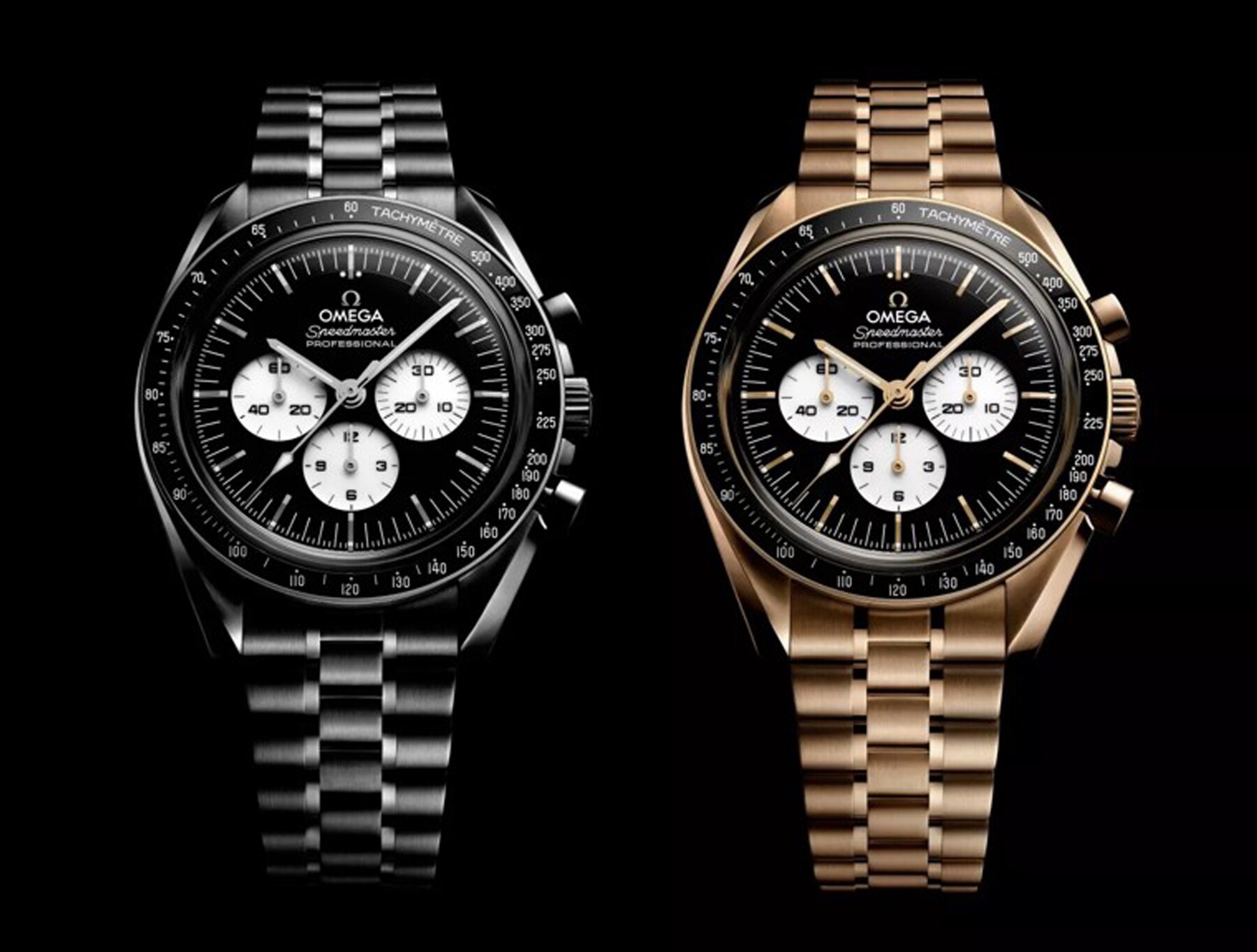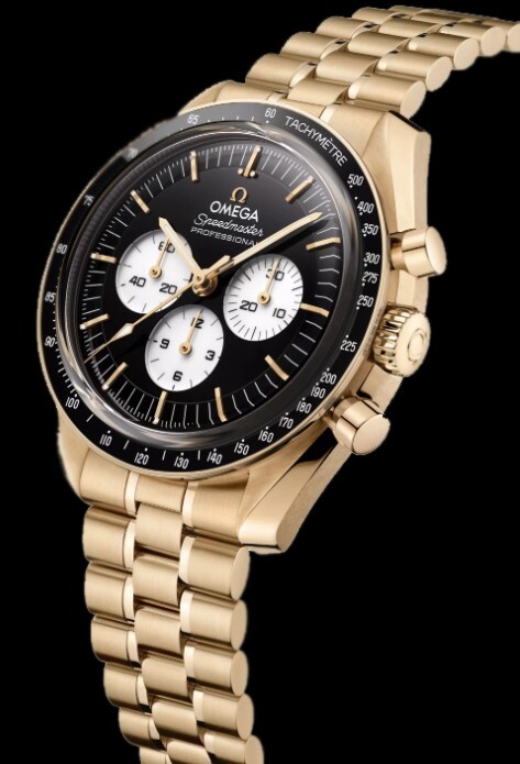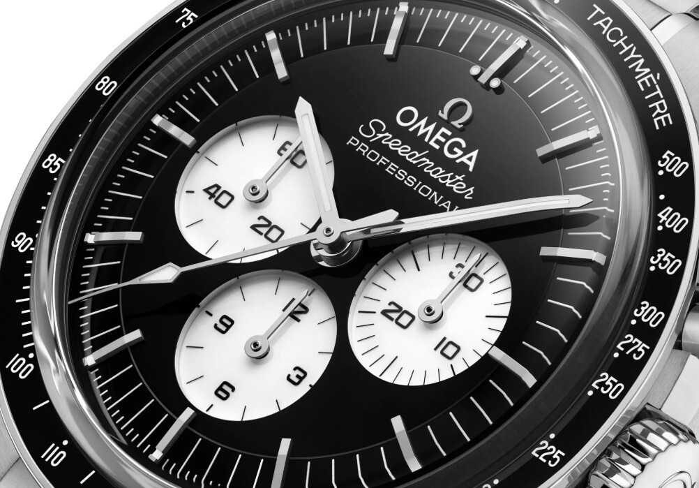 In combination with the black and white dial, the new watches include black ceramic bezel rings filled with a tachymeter scale in white enamel. The front features a box-form scratch-resistant sapphire crystal with an anti-reflective treatment. Around the wrist, the watches are distinguished by their polished-brushed bracelets, created in the standard Moonwatch style with OMEGA's patented comfort release adjustment system.